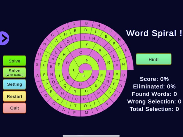 C’est vous contre WordSpiral pour le score le plus élevé. Trouvez des mots en sélectionnant les lettres voisines et cliquez deux fois sur la dernière lettre pour accepter le mot. S’il est valide, regardez le mot disparaître une lettre à la fois et réduisez la spirale. Essayez de supprimer toute la spirale. Réinitialisez ensuite le tableau et demandez à l’IA de résoudre le même jeu pour comparer vos scores.