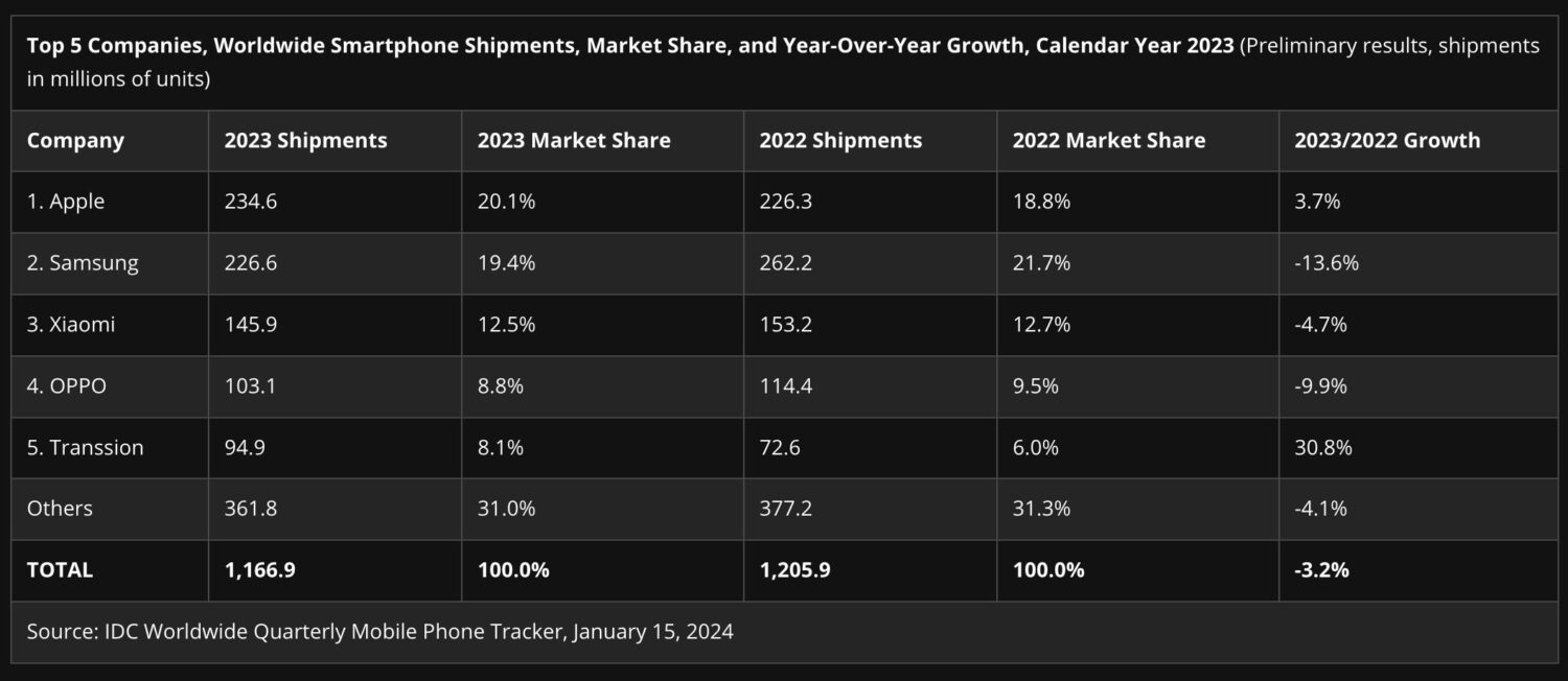 Ensemble, les autres constructeurs ont vendu 361,8 millions de smartphones ; la baisse a été de 4,1% et la part de marché, de 31% sur un an. Au total, 1,17 milliard de smartphones sont vendus en 2023, ce qui représente une baisse de 3,2% par rapport à 2022.