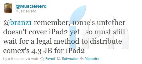 @branz1 rappelle-toi, l’exploit untethered de i0n1c ne fonctionne pas encore sur iPad 2…on doit encore attendre une méthode légale pour distribuer le jailbreak 4.3 de comex pour l’iPad 2