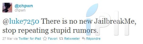 Seulement, du côté de ChPwn, la nouvelle version de JailbreakMe ne serait qu’une rumeur idiote. C’est ce tweet qui confirme que le jailbreak de Comex utilisera des méthodes légales car il ne sera pas de type userland. On peut donc s’attendre à un outil qui s’exécutera depuis un système d’exploitation tel que Windows, Mac OS X et/ou Linux.