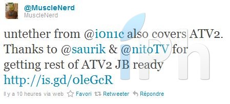 Le jailbreak untethered de @i0n1c supporte aussi l’Apple TV 2G. Merci à @saurik & @nitoTV pour avoir gér_____É_______ tout ce qui a autour du jailbreak de l’Apple TV 2G.