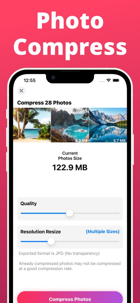 Compresseur Photo: Compresser vous permet de compresser vos photos en toute simplicité! Économisez de l’espace et du stockage sur votre appareil! Comprimez en choisissant la qualité et le taux de redimensionnement de résolution souhaités pour vos photos. Obtenez des photos de taille plus petite qui libéreront un espace supplémentaire important. L’application peut vous aider à nettoyer votre téléphone ou votre appareil des photos volumineuses indésirables. Vous pouvez également utiliser l’application pour compresser des photos ou redimensionner vos fichiers photo afin d’envoyer ou de partager des fichiers photo plus petits.