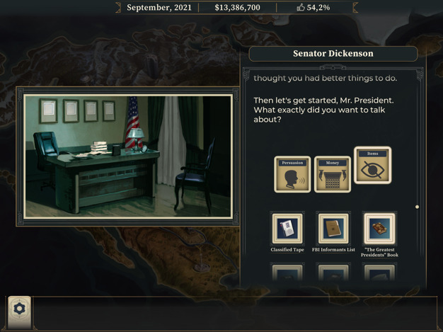 Ceci est le Président est un jeu de gestion basé sur une histoire. En 2020, vous êtes élu président des États-Unis d’Amérique. Pour échapper à la justice pour vos crimes passés en tant qu’homme d’affaires multimillionnaire louche, vous devez ratifier l’amendement 28 qui accorderait l’immunité à vie à tout président.