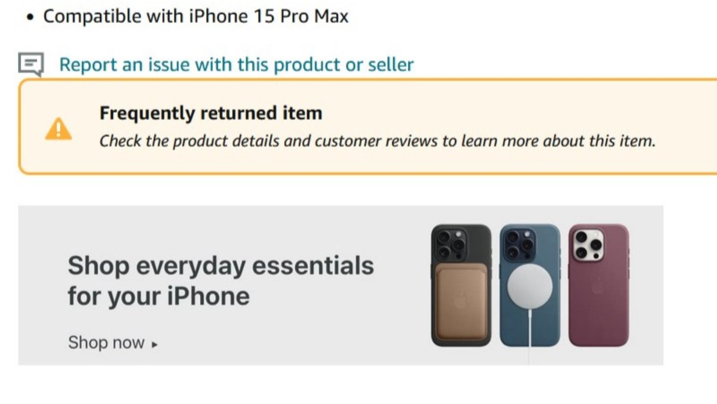 « Article fréquemment retourné. Consultez les détails du produit et les commentaires des clients pour en savoir plus sur cet article », pouvons-nous lire sur un bandeau retrouvé au niveau des fiches des coques FineWoven d’Apple sur le site et l’application d’Amazon.