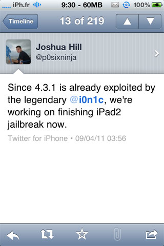 Puisque le jailbreak de l’iOS 4.3.1 est déjà exploité par le légendaire @i0n1c, nous travaillons actuellement sur la finition du jailbreak de l’iPad 2.