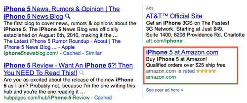 Nous ne connaissons pas encore la date de sortie de l’iPhone 5 mais plusieurs rumeurs ont supposées que la sortie serait retardée à Septembre ou tout simplement, en Juin comme toutes les autres années. Amazon a vu grand et a lancé une campagne de publicités textuelles sur la barre latérale droite d’une recherche Google contenant le terme « iPhone 5 ».