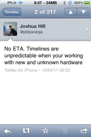 p0sixninja, un des membres de la chronic dev-team, a publié sur son twitter quelques nouvelles de l’avancé du jailbreak de l’iPad 2, qui comme vous le savez n’est toujours pas disponible du fait de sa mise à jour hardware.