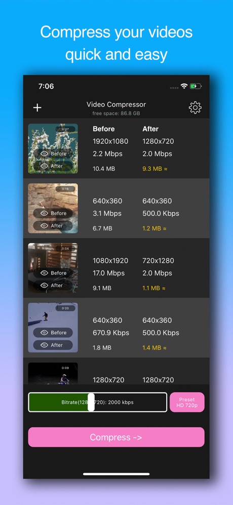 Vous manquez d’espace à cause d’un trop grand nombre de vidéos sur votre téléphone ? Utilisez le compresseur vidéo GOLD pour les compresser et libérer de l’espace pour stocker plus de vidéos, d’applications et de musique !