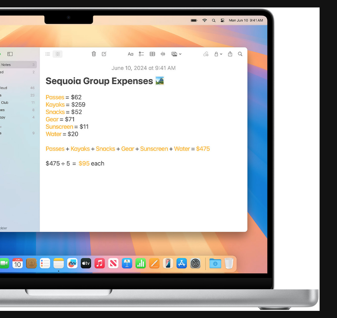 Calculez des nombres, évaluez des expressions et attribuez des variables, directement depuis Notes. L’application résout les expressions en ligne dès que vous tapez un signe égal.