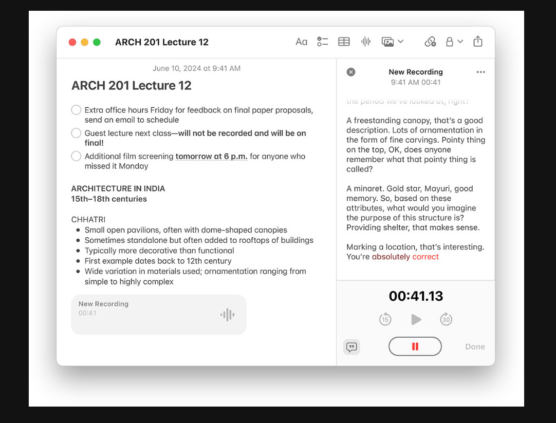 Avec la transcription audio en direct au sein de l’application Notes sur macOS Sequoia, vous pouvez enregistrer des sessions audio dans votre note et générez des transcriptions audio en direct que vous pouvez rechercher ou combiner avec d’autres commentaires, listes de contrôle ou documents.