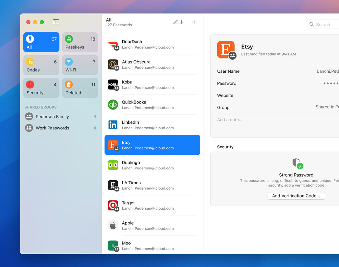 Grâce à un cryptage sécurisé de bout en bout et une synchronisation transparente, l’application Mots de passe stocke en toute sécurité toutes vos informations d’identification. Vous pouvez filtrer et classer les comptes selon différents critères, comme la récence de leur création, le type d’identifiant ou s’ils sont inclus dans un groupe partagé, facilitant ainsi la recherche des comptes dont vous avez besoin.