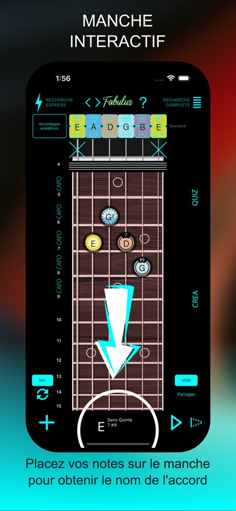 Noms positions décomposition de tous les types d’accords et leurs renversements en n’importe quel accordage +Quiz +Gammes +cycle des quintes. 0 pub ni collecte de donnée. Si vous vous êtes déjà demandé « Quel est cet accord ? » ou si vous voulez simplement découvrir de nouveaux accords, FABULUS EST POUR VOUS ! Il suffit de sélectionner deux notes ou plus sur le manche interactif pour obtenir le nom de l’accord et le rôle de chaque note, vous pouvez aussi parcourir une liste de plus de 100 000 accords !
