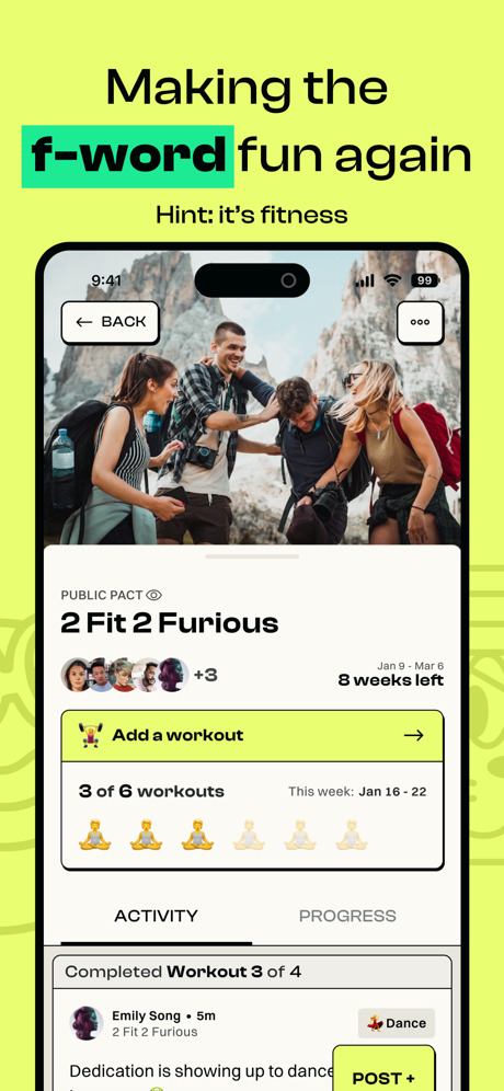 Les séances d’entraînement ennuyeuses sont finies. Il est temps de s’amuser. Fitness Pact vous permet de créer une connexion fitness avec vos amis. C’est le meilleur moyen de vous responsabiliser, vous et un ami. Tout d’abord, vous sélectionnez votre séance d’entraînement et la fréquence à laquelle vous souhaitez la terminer. Ensuite, vos amis choisissent la leur. Enfin, vous déterminez chacun votre « récompense » ou votre punition en cas d’échec. Fitness Pact suit tout pour vous. Tout ce que vous avez à faire, c’est de vous amuser (et de vous entraîner, bien sûr). Nous créerons automatiquement un flux de groupe pour que vous et vos amis puissiez rire (ou vous encourager) les uns des autres. Vous pourrez également suivre les « punitions » de chacun. Contrairement aux réseaux sociaux, une connexion fitness vous motivera vraiment.