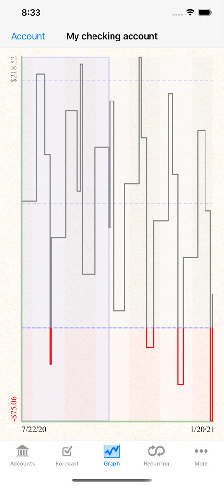 Cashflows vous aide à prévoir les soldes futurs de vos comptes bancaires. Il est simple à configurer et nécessite un minimum d’efforts pour le maintenir. Informez-le de vos transactions récurrentes (y compris les virements entre comptes) et de vos futures transactions ponctuelles, et laissez-le estimer les soldes de vos comptes dans les mois (ou les années) à venir. Il ne s’intéresse pas au passé, il n’est donc pas nécessaire de saisir ou de maintenir votre historique de transactions.