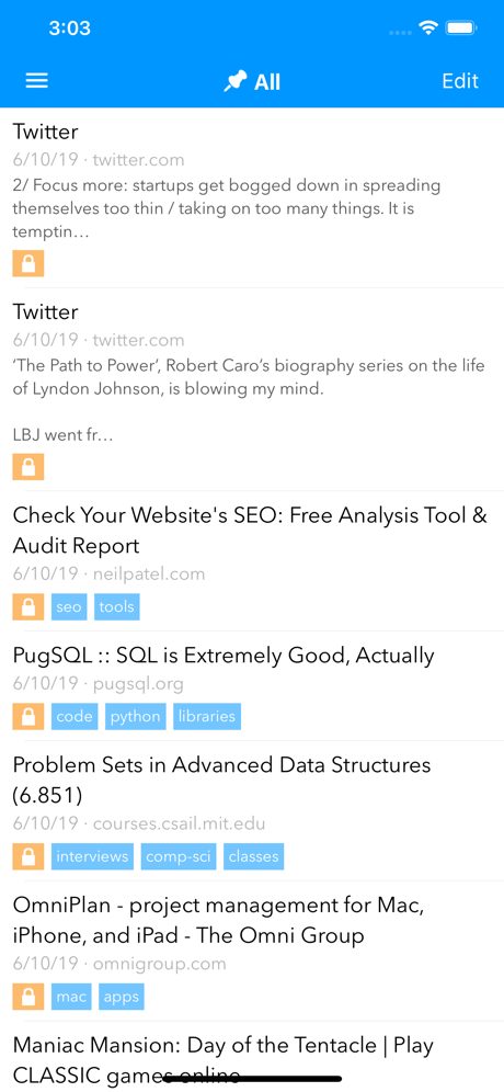 Pushpin est un client Pinboard pour iOS magnifique, ultra rapide et riche en fonctionnalités. Conçu pour les utilisateurs expérimentés comme pour les débutants, Pushpin vous permet de parcourir, rechercher, ajouter, modifier et supprimer des signets de manière transparente grâce à une interface magnifique. Il est également livré avec deux extensions de partage faciles à utiliser pour vous aider à ajouter rapidement des signets à partir de n’importe quelle application.