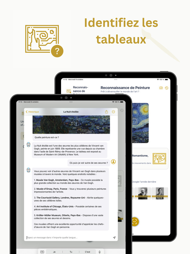Que « La Nuit étoilée » vous inspire. Découvrez le monde de l’art avec notre Identificateur de peintures. Explorez le génie créatif des plus grands peintres de l’histoire.