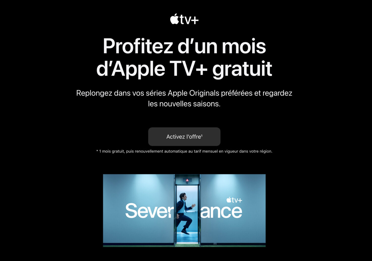 En effet, en se rendant sur le site d’Apple, voici ce que nous pouvons lire : « Profitez d’un mois d’Apple TV+ gratuit. Replongez dans vos séries Apple Originals préférées et regardez les nouvelles saisons ». Si vous voulez profiter de l’offre, cliquez sur ce lien et appuyez sur le bouton « Activez l’offre ».
