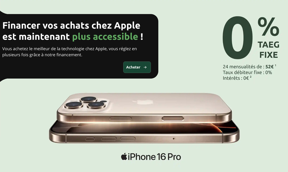 Les intérêts seront pris en charge par Apple, qui mise sur les volumes de ventes pour compenser le coût de cette promotion ; les détails financiers de l’accord restent confidentiels. Sur son site, Cetelem met en avant le financement à 0% pour les produits Apple, y compris l’iPhone. Par exemple, l’iPhone 16 Pro 128 Go est proposé à 51,21 euros par mois pendant 24 mois.