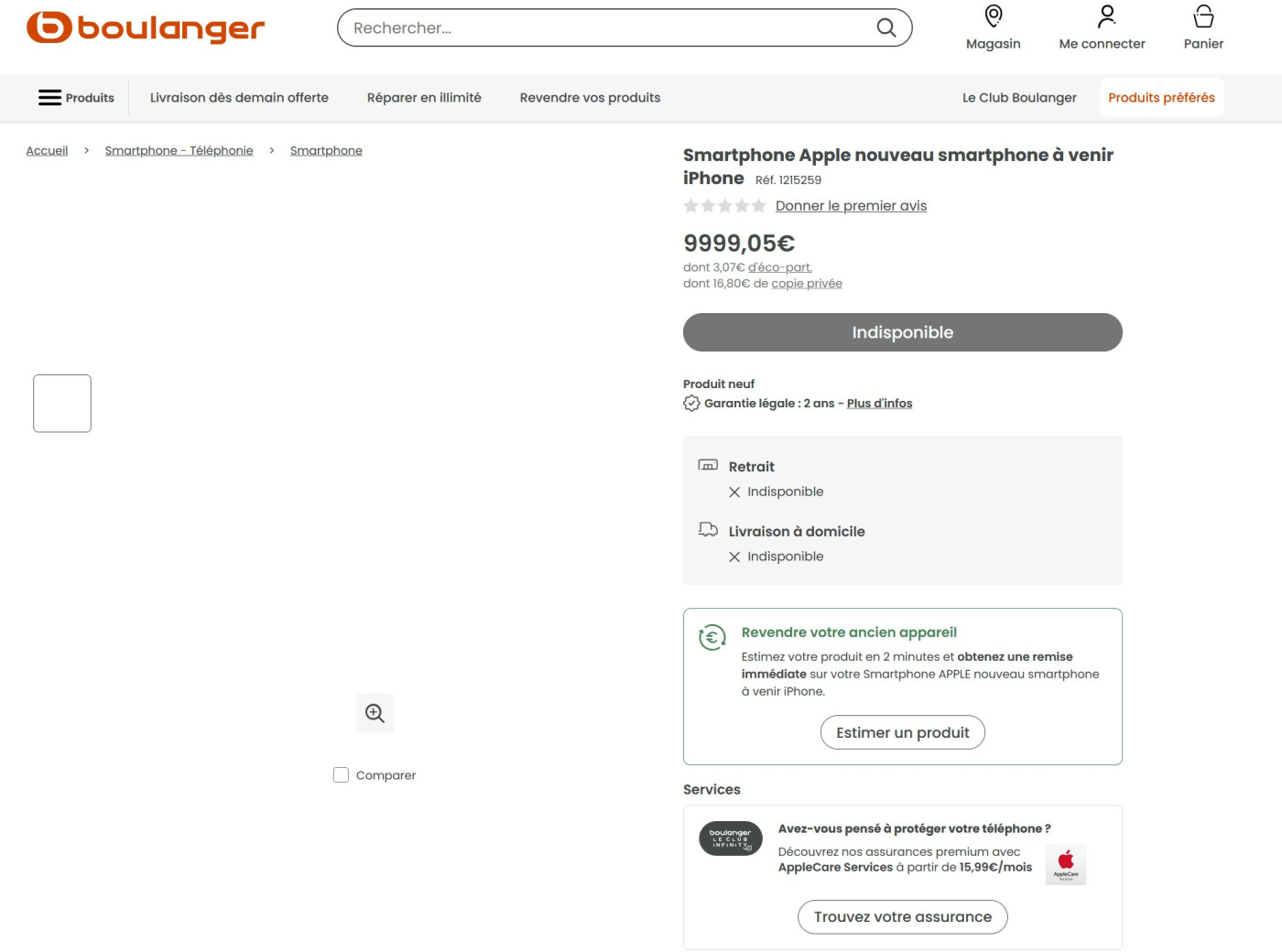 L’enseigne a mis en ligne une fiche produit mystérieuse intitulée « Smartphone Apple nouveau smartphone à venir iPhone », sans photos ni caractéristiques détaillées, mais avec un prix fictif affiché à 9999,05 euros, en attendant l’annonce officielle.