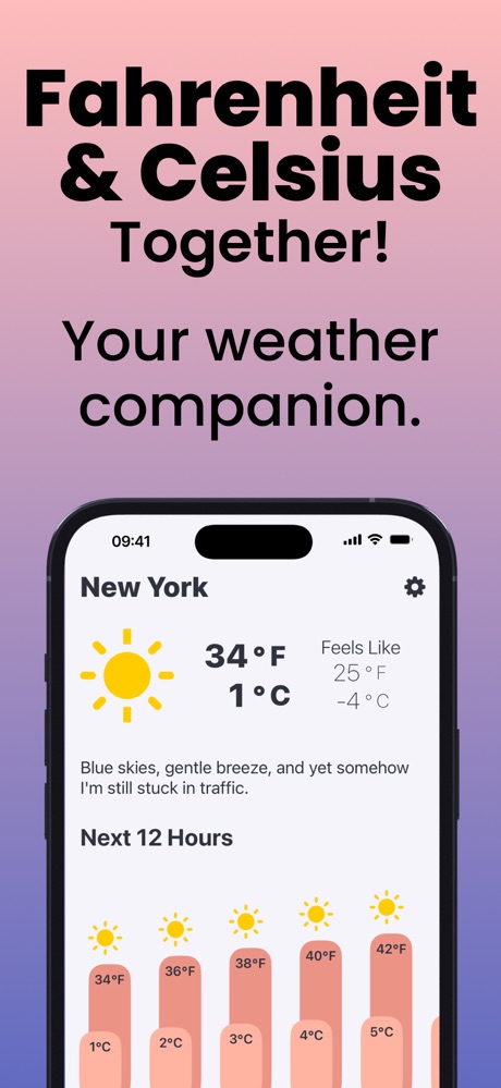 Météo Celsius et Fahrenheit réunies ! Enfin ! Vous êtes un Américain vivant ou voyageant à l’étranger et vous ne savez pas si 15 degrés Celsius, c’est chaud ou froid ? Ou vous êtes un étranger aux États-Unis et vous vous demandez pourquoi il neige à -25 degrés ? Ne cherchez plus, WeatherGO a la solution ! WeatherGO convertit la température en temps réel. Vous pouvez désormais discuter de la météo avec vos amis, vos rendez-vous Tinder et les passants sans l’angoisse paralysante de ne pas savoir si 35 degrés Celsius, c’est la température idéale pour aller à la plage (c’est le cas) ou s’il faut porter un pull quand il fait -15 degrés (c’est le cas).