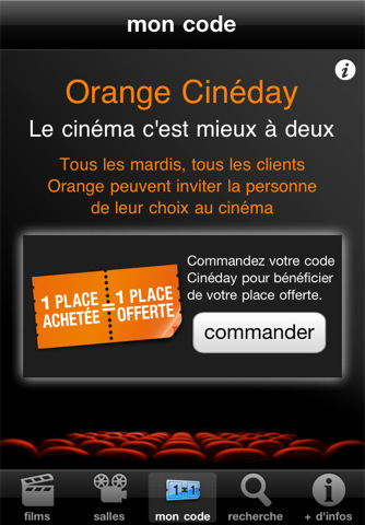 Dans cette optique, Orange propose à tous ses clients mobile/ADSL une place de cinéma gratuite pour une place achetée et ce tous les mardis !