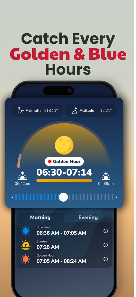 Golden Hour: Phototime – Votre outil ultime pour suivre le soleil et la lune en photographie. L’application populaire et primée Golden Hour: Phototime est désormais disponible sur iOS ! Conçue spécialement pour les photographes, les amateurs de plein air et tous ceux qui recherchent la lumière naturelle parfaite, Phototime est votre compagnon idéal pour suivre les couchers, levers de soleil et les phases lunaires — directement dans votre poche. Suivez facilement les moments les plus photogéniques de la journée, y compris l’heure dorée, l’heure bleue et toutes les phases du crépuscule — civil, nautique et astronomique. Avec une interface claire et conviviale, l’application fournit des horaires précis de lever et de coucher du soleil en fonction de votre position ou de toute ville enregistrée — même hors ligne.