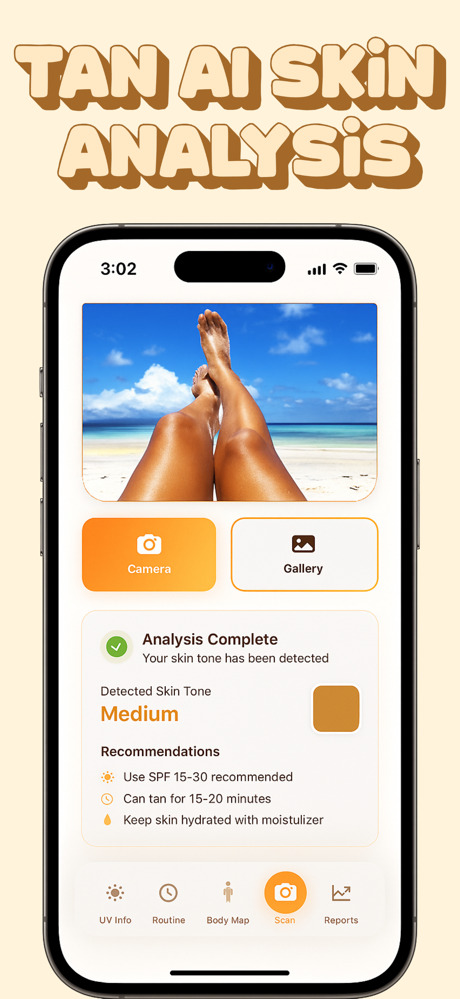 Obtenez un bronzage parfait en toute sécurité grâce à la surveillance UV en temps réel, aux séances guidées et à l’analyse de la peau par IA ! Tan Routine est votre compagnon de bronzage complet, conçu pour les débutants comme pour les passionnés de bronzage qui souhaitent des résultats magnifiques et uniformes tout en protégeant leur peau. Maîtrisez l’art du bronzage en toute sécurité. Transformez votre routine de bronzage avec Tan Routine, l’application professionnelle qui combine informations météo, séances guidées et science de la peau pour vous aider à obtenir un bronzage parfait en toute sécurité et efficacité.