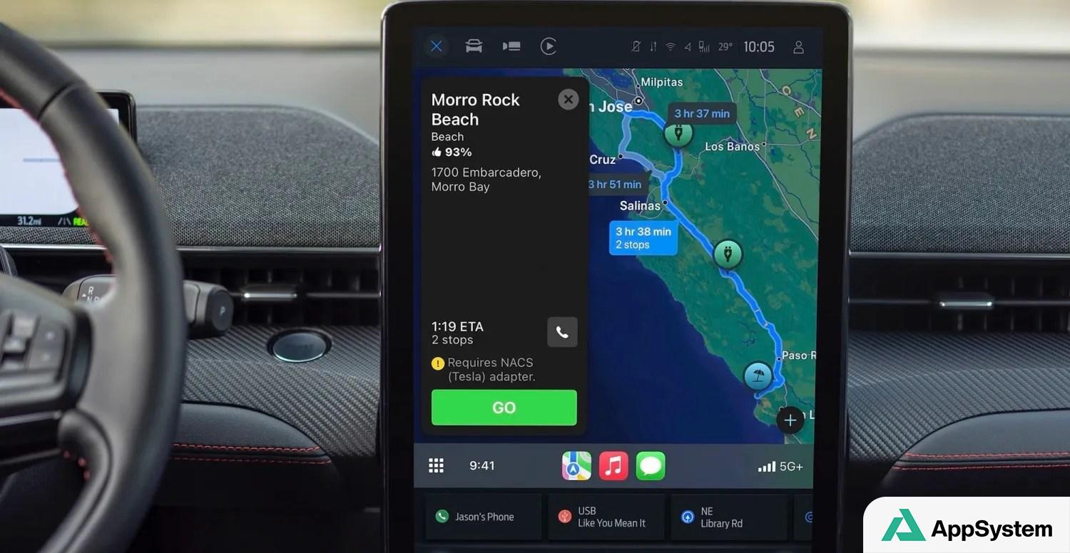 Le Ford Mustang Mach‑E fait partie des rares modèles compatibles avec l’itinéraire VE d’Apple Plans dans CarPlay, une fonction qui planifie les trajets en véhicule électrique en ajoutant automatiquement les arrêts de recharge nécessaires.