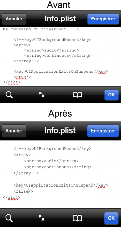 Bonsoir, il y a un problème dans le tuto. Il faut remplacé trie par false les screenshot sont bon mais pas l’explication. Je viens de tester sur mon iPhone 4 ça marche parfaitement. Menoa