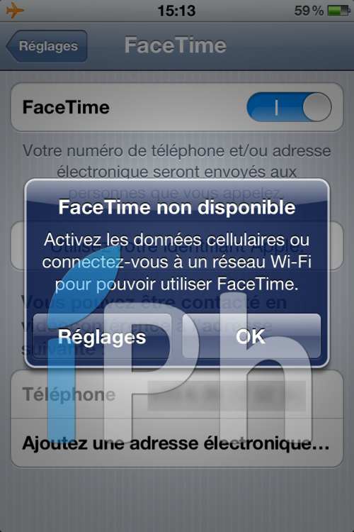 Le message ici indique que l’utilisateur doit se connecter à un réseau wifi ou d’activer le réseau cellulaire pour pouvoir utiliser FaceTime. Cependant, si l’erreur apparait c’est que tout simplement les opérateurs n’ont toujours pas donné la possibilité d’émettre des appels FaceTime en 3G (ce qui pour le moment semble logique).