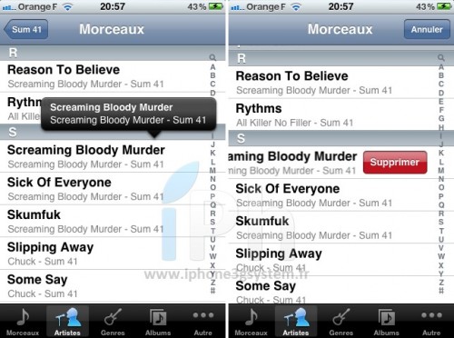 Pour ceux qui veulent supprimer les musiques – comme les vidéos pour l’iOS 4.x – directement depuis leur appareil, c’est désormais possible avec l’iOS 5. Il suffira de slider la musique à supprimer pour voir apparaitre le bouton « Supprimer ».
