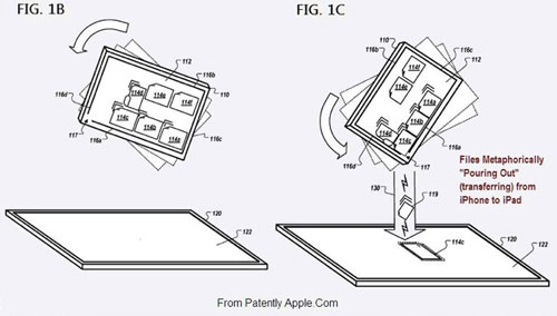 Le brevet décrit en fait la possibilité de partager des données en les faisant littéralement couler d’un appareil à l’autre. De nombreuses animations semblent bien sur être présentes sur les 2 appareils. Encore mieux, ces animations respectent une des lois élémentaires de la physique qui régit notre univers : le poids. Ainsi, en fonction du poids du fichier, celui-ci sera placé plutôt en bas dans l’animation, contrairement aux fichiers plus légers.