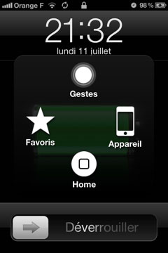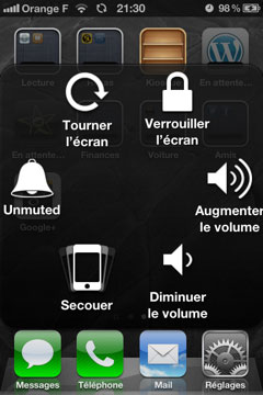 - La fonction AssistiveTouch a enfin été activée. Cette fonctionnalité se concrétise par la présence d’un gros bouton blanc en bas à droite du springboard et de menus transparents