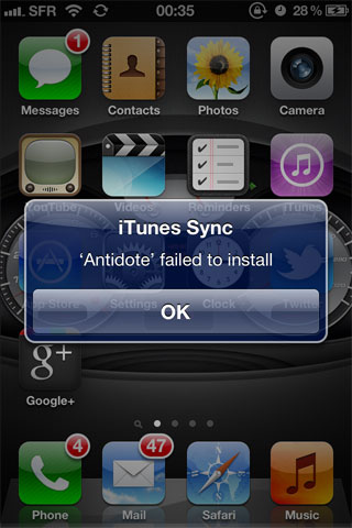 12) Lors de la synchronisation iTunes, un message apparait désormais sur l’iPhone indiquant les erreurs survenues pendant la synchronisation :