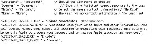 9to5mac a donc réussit à avoir un screenshot, d’un appareil de test, de cette fonction qui ressemblerait fortement à Siri (première image) mais encore un bout de code (seconde image) prouvant l’existence de l’assistance vocale qui associerait Siri et Nuance dans un même paramètre.