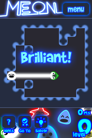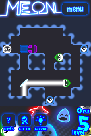 Meon est un jeu de réflexion « mignon et addictif ». Une série d’énigmes vous sera posée (120 au total) où la difficulté se fait sentir au fur et à mesure des niveaux. Le but est simplement de résoudre les petits problèmes de façon stratégique.