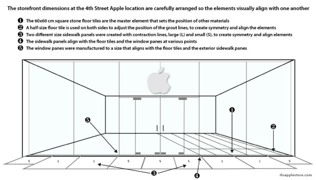 C’est avec un petit sourire que l’on remarque qu’Apple a tout de même poussé la perfection à l’extrême : symétrie parfaite, une façade entièrement en verre (plus aucun soutien métallique), et bien sur des pavés de trottoir parfaitement symétriques qu’Apple a fait refaire pour l’occasion.