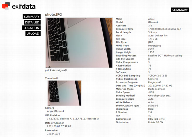 Cette photo prétend avoir été prise par un iPhone 4, mais le reste de ses données EXIF indique une toute autre histoire. Bien que l’image ai été recadrée en 2235 x 2291 px (5,12 mégapixels), l’image originale était beaucoup plus grande 3264 x 2448 px soit 8 mégapixels. De plus l’objectif présente les caractéristiques suivantes 4.3mm f/2.4 qui sont meilleurs que celui de l’actuel iPhone 4 : 3.85mm f/2.8.
