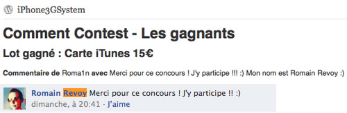 Nous utilisons un plugin wordpress appelé « Comment Contest » qui se charge de tirer au sort un commentaire dans l’article (comme tu peux le voir sur le screenshot dans l’article). Puis nous vérifions à l’aide d’une recherche toute simple que le participant a également commenté sur facebook.