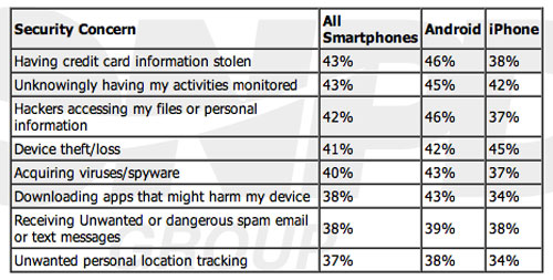 Le groupe NPD a récemment mené une enquête auprès des utilisateurs de smartphone dans le but d’obtenir leur avis concernant leur sécurité vis-à-vis de tout ces systèmes informatiques. Plus particulièrement, le groupe s’est intéressé aux utilisateurs d’iPhones et d’appareils tournant sous Android. Les résultats ont ensuite été retranscrits dans un tableau que voici.