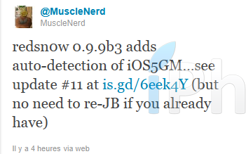 MuscleNerd précise d’ailleurs que si vous avez déjà jailbreaké l’iOS5 GM en utilisant ipsw de la bêta 7 comme il était possible de le faire, il n’est pas nécessaire de re-jailbreaker avec cette nouvelle version de RedSn0w.