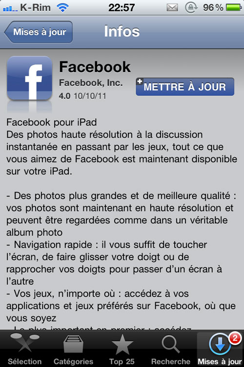 Vous dites que des betises c’est dingue. Ya aucune application Facebook pour iPad et aucune mise a jour pour iPhone a l’heure actuelle. D’ou vous sortez cela?