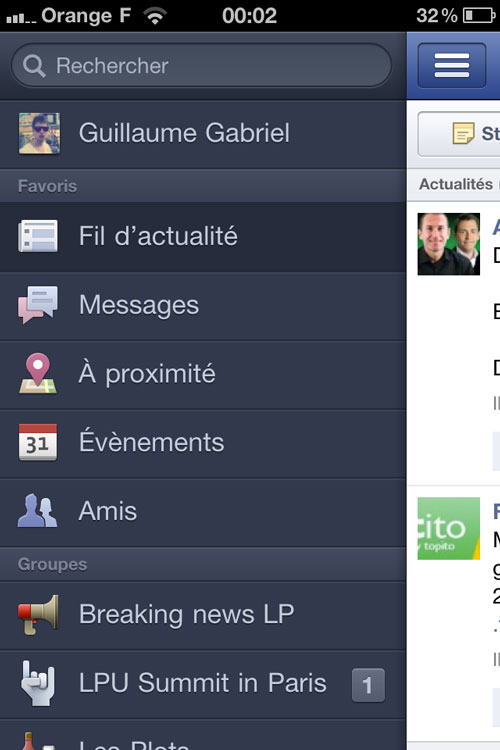 Également une barre latérale fait son apparition, comme sur le site Internet Facebook. En première partie, vous aurez vos messages, les lieux, les évènements et vos amis. En deuxième partie, on retrouve vos différents groupes. Et enfin, en dernière partie, les applications (photos, jeux favoris, articles) ainsi que vos réglages.