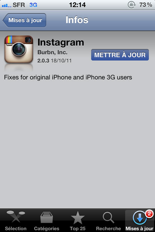 Instagram, application du réseau social de la photographie, se met à jour et passe en 2.0.3 ! Elle apporte la correction des bugs sur l’iPhone V1 et 3G. Pour rappel, cette application permet de prendre des photos et d’appliquer des filtres directement sur celles-ci. Partagez ensuite ses photos sur votre profil Instagram, Facebook, Twitter et d’autres ! Une application devenue célèbre, qui permet de raconter sa vie en photo !