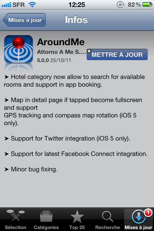 - La carte, dans la page de détail, peut être en plein écran et supporte le GPS/boussole pour faire tourner la carte (seulement sur iOS 5)