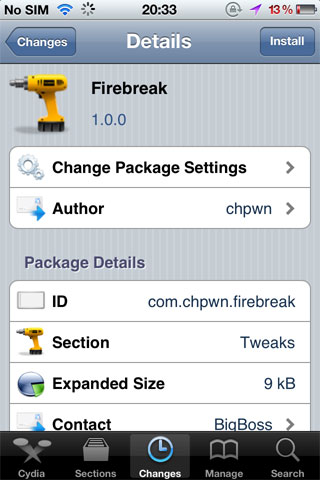 Le tweak se nomme Firebreak et n’ajoute aucune icône sur votre appareil. Aucune réglage n’est à faire. Seul un redémarrage de l’écran d’accueil de votre appareil vous sera demandé, permettant de rendre le tweak effectif.