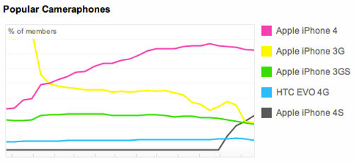L’iPhone 4S fait beaucoup parler de lui, et aujourd’hui encore, son nom revient. En effet, il se classe deuxième dans le classement des » téléphones appareils-photo » les plus utilisés sur Flickr. Seulement cinq semaines après sa sortie, ce qui est impressionnant tout de même ! Il se place juste derrière… l’iPhone 4 et devance le 3GS. Au passage, un autre classement a vu le jour, celui des « appareils-photo » les plus utilisés, et c’est à nouveau l’iPhone 4 qui est en haut du podium, devant le Nikon D90 et le Canon EOS.