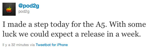 pod2g vient d’annoncer sur Twitter qu’il a fait un pas de plus concernant le Jailbreak des puces A5 (iPhone 4S et iPad 2). Il estime qu’avec un peu de chance le Jailbreak sera disponible dans une semaine.