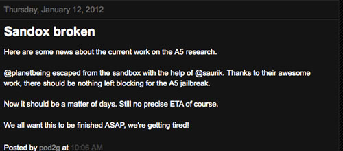 Planetbeing vient de résoudre la sandbox avec l’aide de Saurik. Merci pour leur travail incroyable, il ne devrait plus y avoir de barrière pour le jailbreak A5.