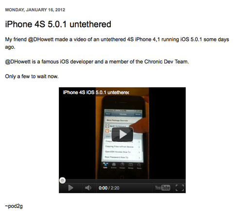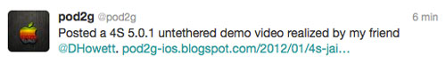 Décidément, Pod2G n’arrête plus ! Il vient de publier un nouvel article dans lequel se trouve la vidéo du jailbreak untethered d’un iPhone 4S sous iOS 5.0.1. C’est un de ses amis et membre de la Chronic Dev Team qui a fait la vidéo de démonstration du jailbreak.